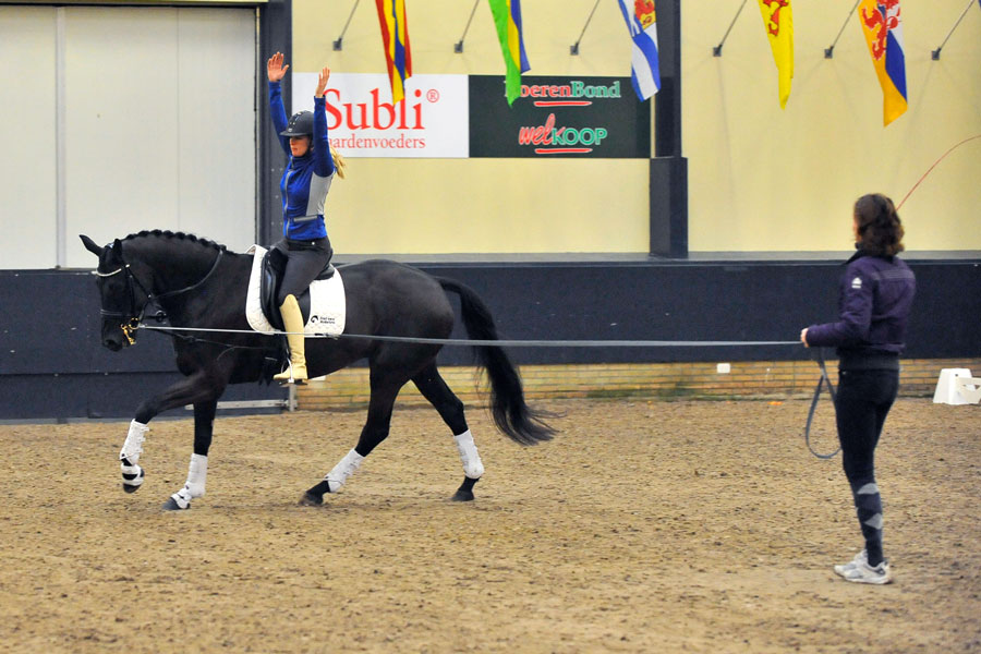 Daarnaast kan ik ook bij Annelies terecht voor lessen op hoger niveau, zo heb ik mijn paard El-Jemo (v. San Remo) in korte tijd van B tot Z2 dressuur opgeleid, waarbij we vele wedstrijden en competities hebben gewonnen. Ook op hoger niveau blijft tijdens de lessen de basis centraal staan, wanneer de basis gedegen is, is het makkelijker om bijvoorbeeld een appuyement of galopwissel te vragen van het paard. El-Jemo was een sensibel paard, maar door rust en vertrouwen te geven kon dit doorbroken worden en resulteerde dit in een fijne samenwerking tussen ons.